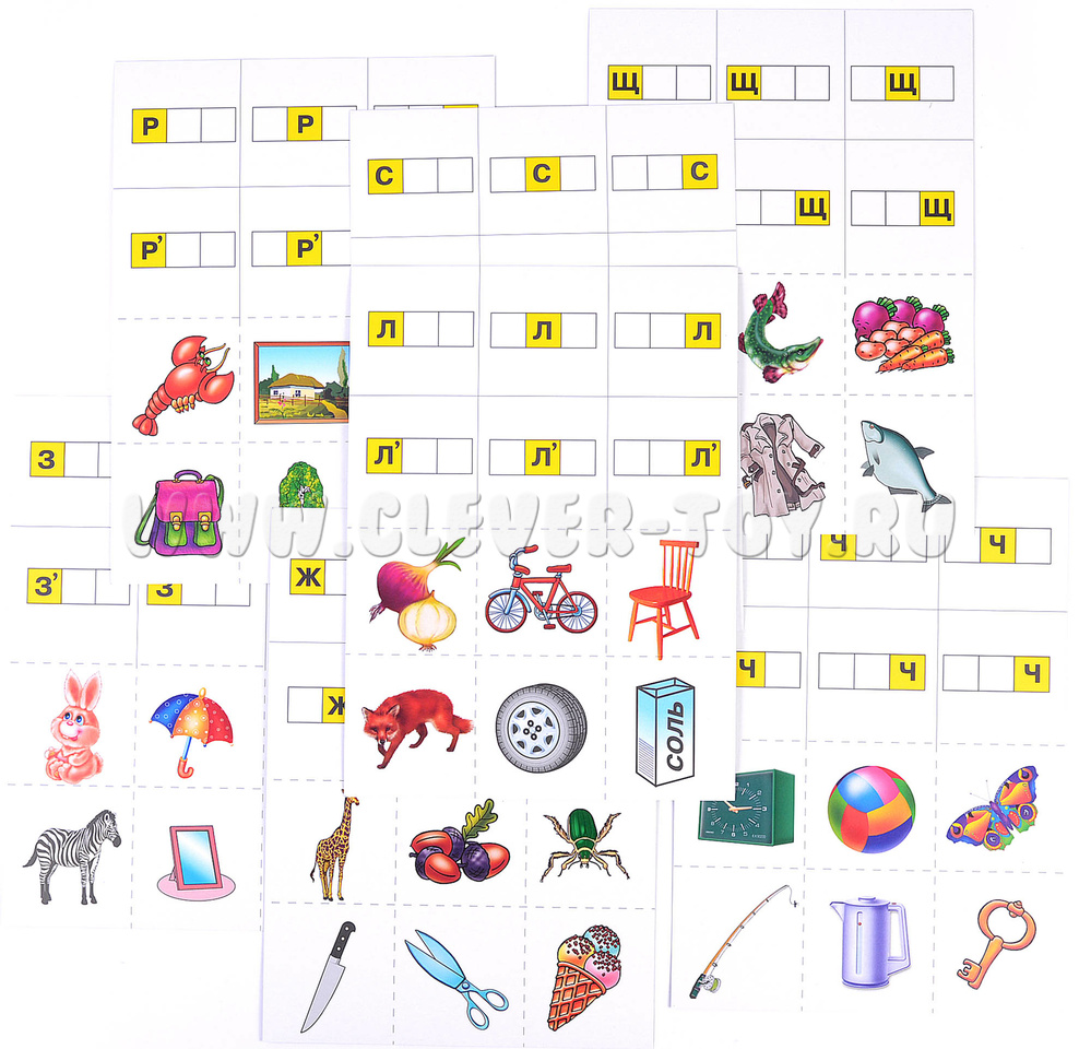 В состав набора входят 8 листов формата А4 и папка для хранения материалов. На каждом листе по 6 разрезных карточек (всего 48) и по 6 схем слов на каждый из "проблемных" согласных звуков. Перед началом игры родителю или педагогу необходимо разрезать карты по пунктирным линиям (получится 48 карточек с картинками и 8 карт со схемами слов).