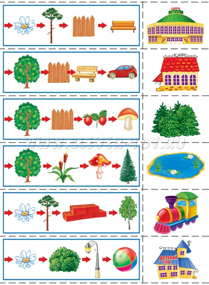 • Разложите перед малышом несколько картинок с предметами, до которых вы раньше добирались по тропинкам. Предложите ребенку запомнить изображеннные на карточках предметы, попросите его отвернуться и поменяйте карточки местами (1-2 предмета можно убрать). Спросите малыша: что изменилось, чего не хватает на поле?