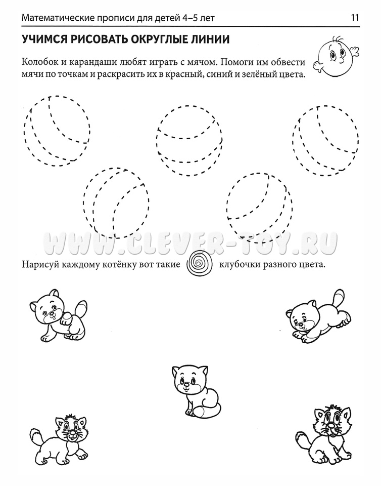 В возрасте 4 - 5 лет у детей начинают формироваться навыки самоконтроля и самооценки выполненной работы. На страницах тетради изображён смайлик Колобок без рта, который ребёнок должен нарисовать самостоятельно, оценив свою работу.