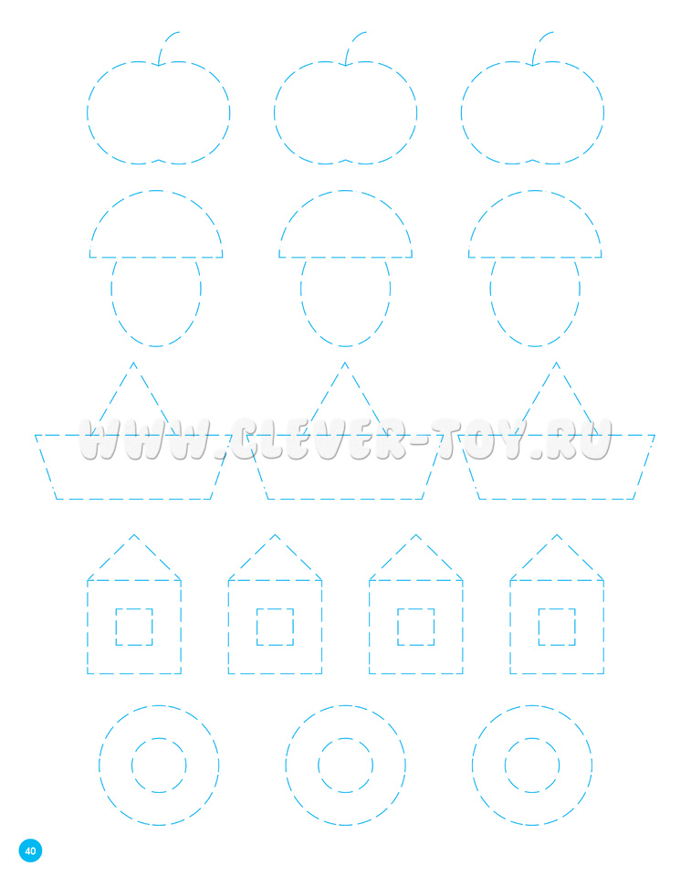 На последних страницах тетради (перед разрезным материалом) представлены первые прописи для ребенка. Малыш может обвести по пунктирным линиям и раскрасить геометрические фигуры и изображения из них. Предложите ему раскрашивать и называть фигуры.