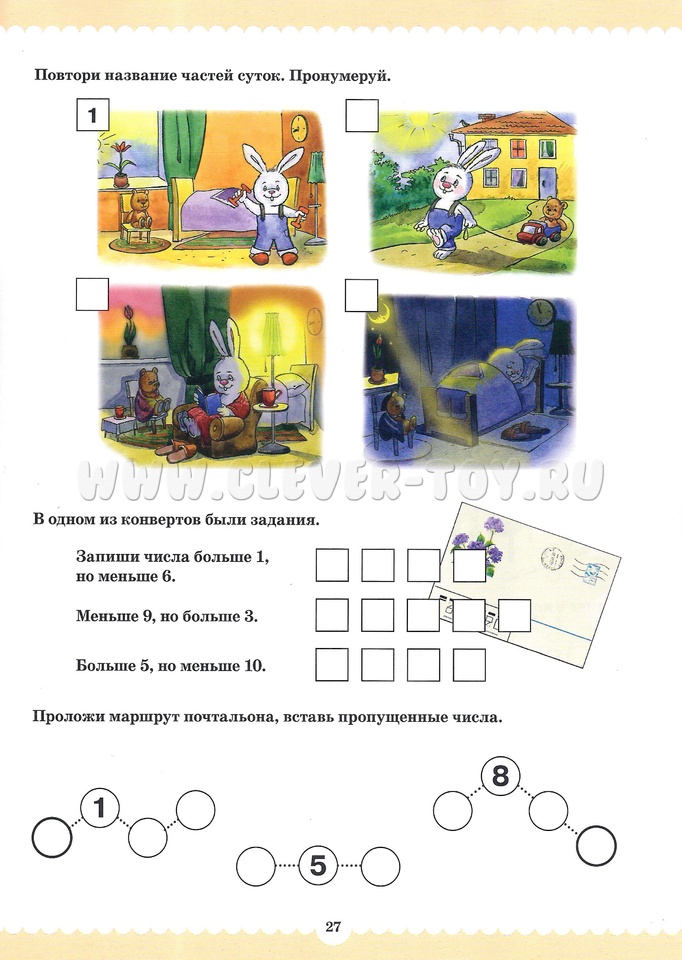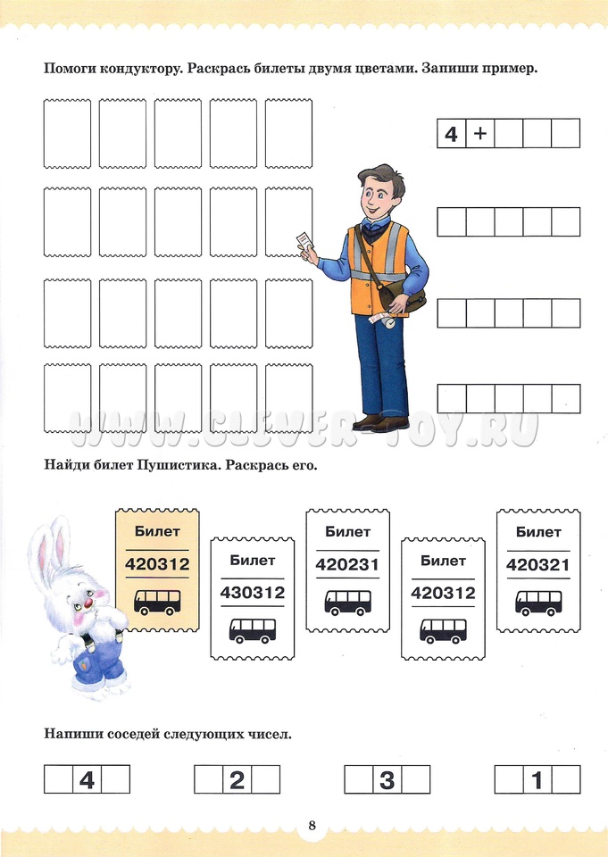 Вместе со сказочными персонажами Рыжиком и Пушистиком малыши, знакомясь с людьми разных профессий, закрепят знания цифр, вспомнят образование чисел и их последовательность, познакомятся с составом чисел из двух меньших, узнают про сложение и вычитание, про математические знаки, научатся решать простые задачки, писать числа, сравнивать их в пределах первого десятка.