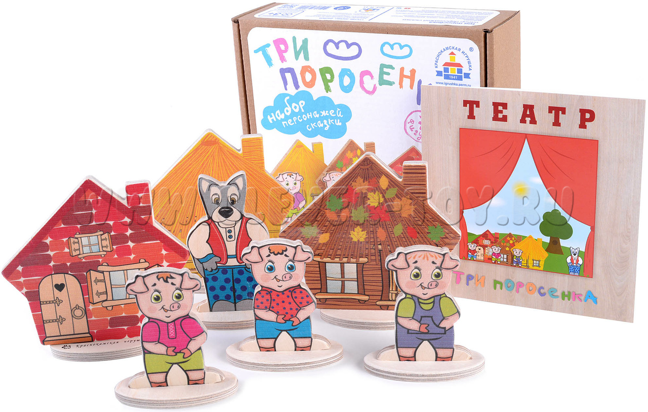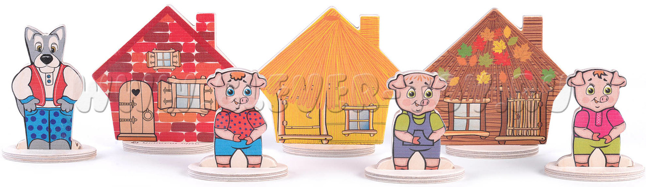 • 7 деревянных фигурок на подставках (3 поросенка, 3 избушки, волк)