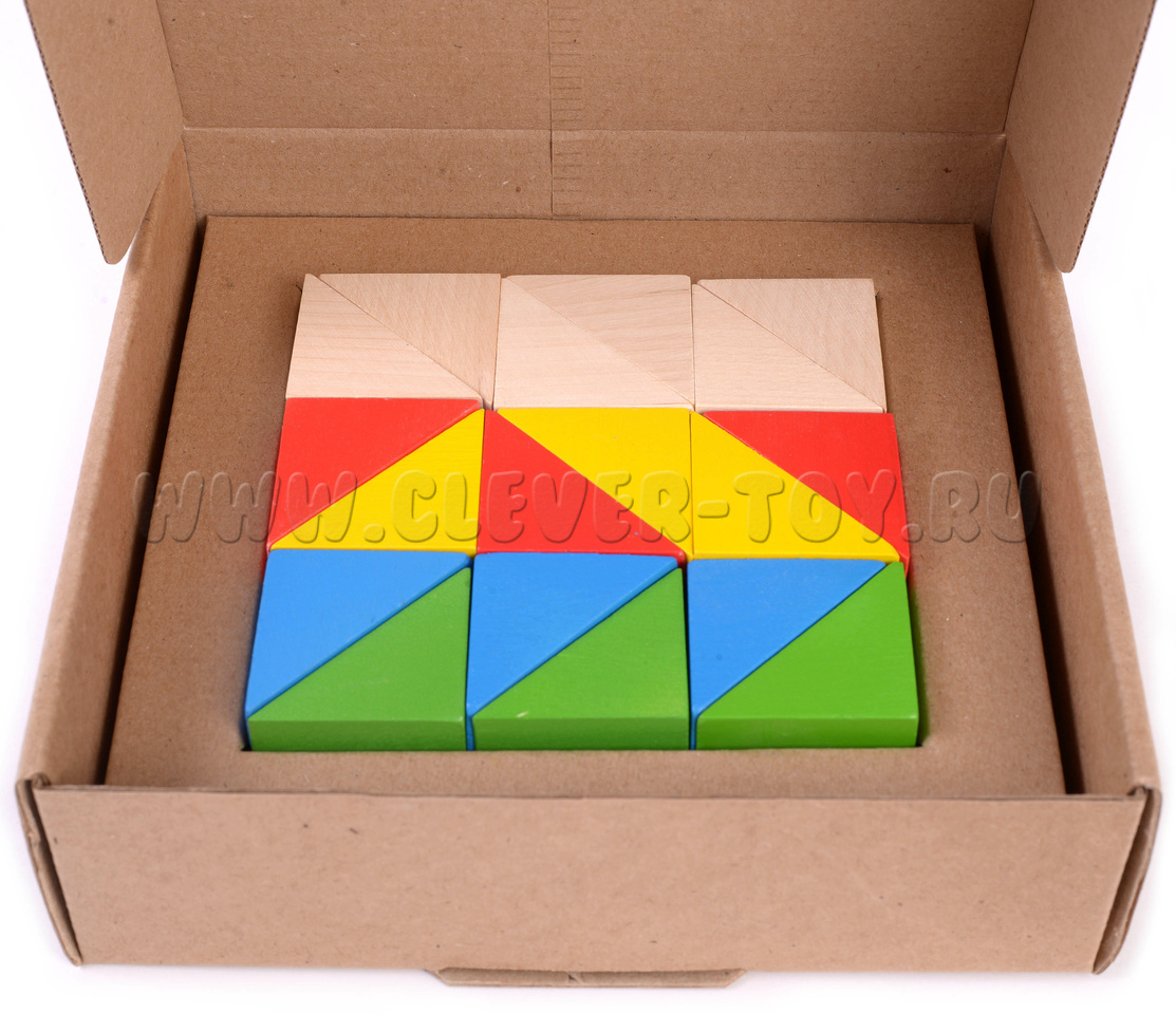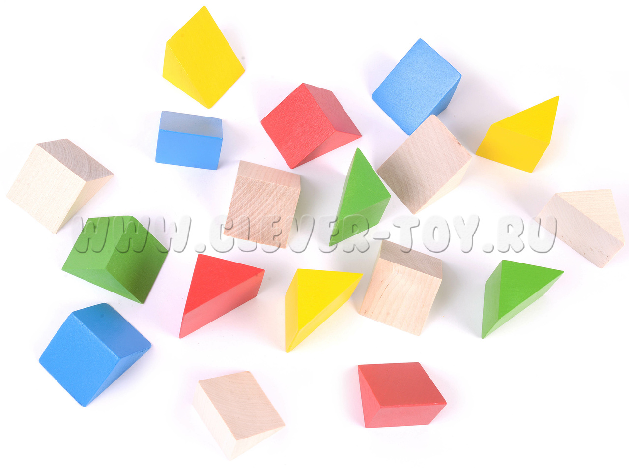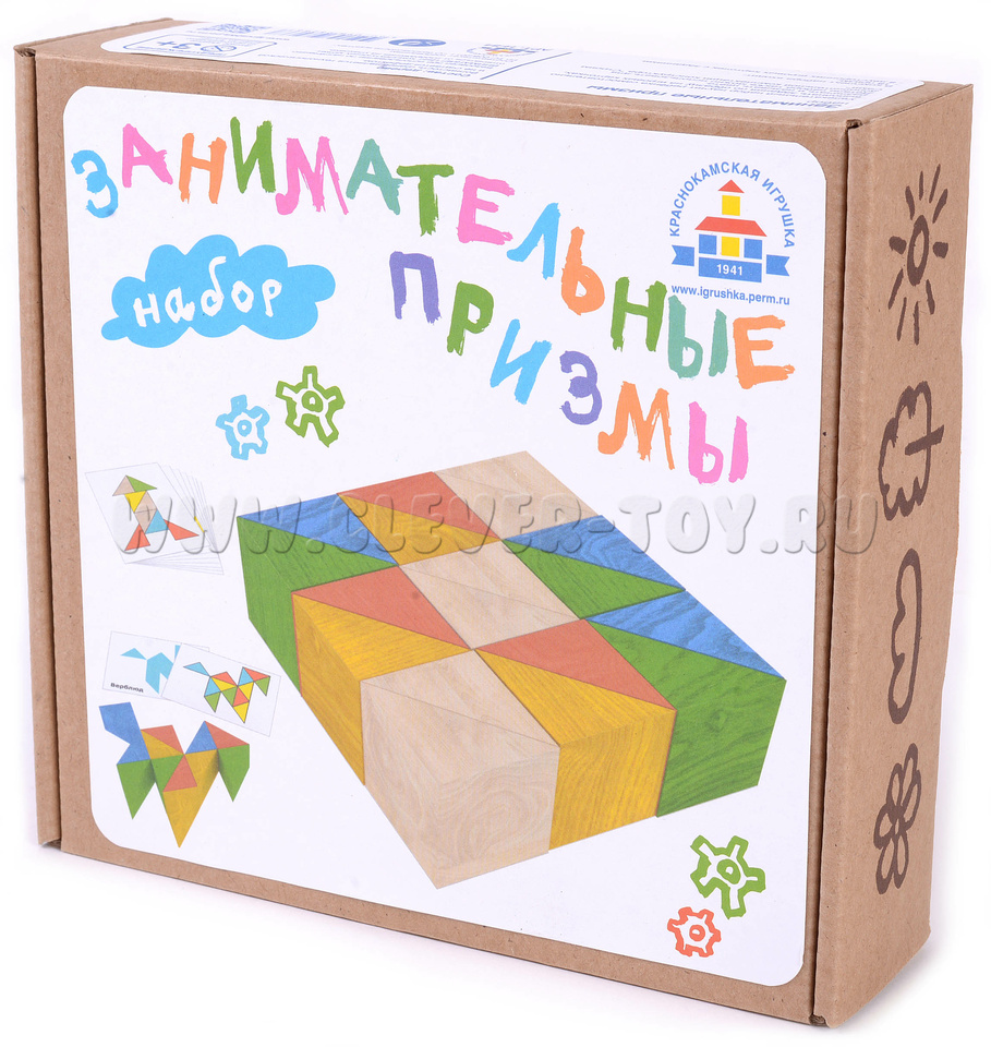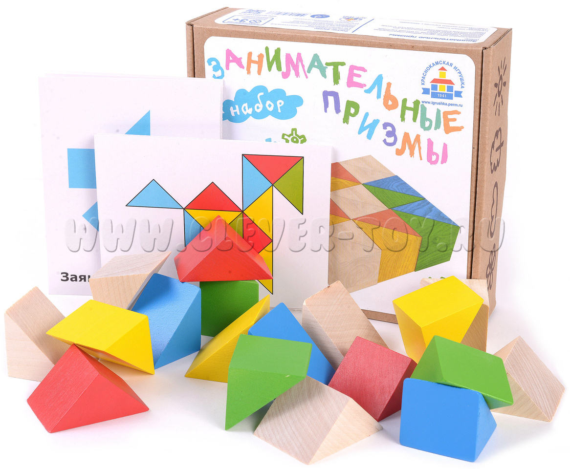 Деревянный конструктор "Занимательные призмы" для самостоятельной сборки ребенком разноцветных фигур по образцам на карточках-заданиях, либо используя воображение.