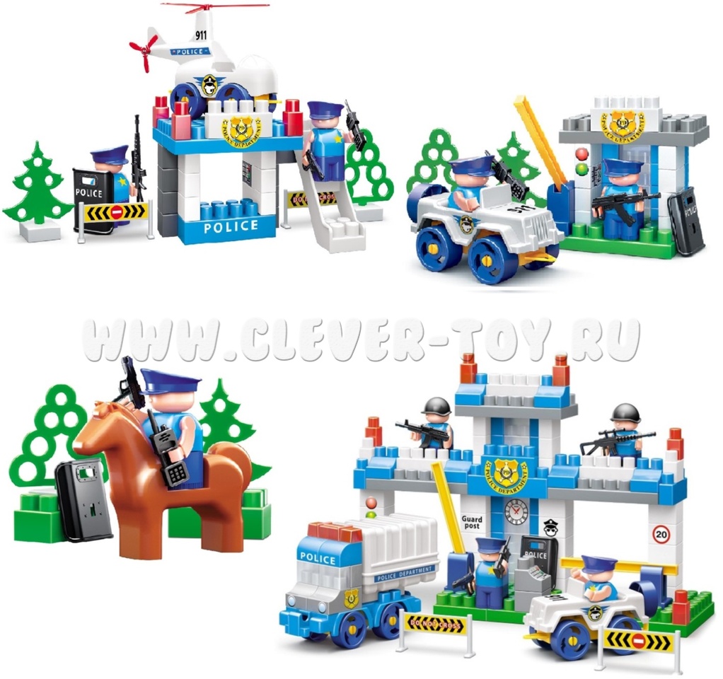 Серия «ПОЛИЦИЯ» имеет особую цветовую гамму и помогает ребенку понять работу полицейских. В набор входят кубики разных размеров и форм, фигурки людей и лошадей, автомобильные кабины, колеса и кузова для создания машин, оружие для фигурок, а также наклейки и декоративные элементы.