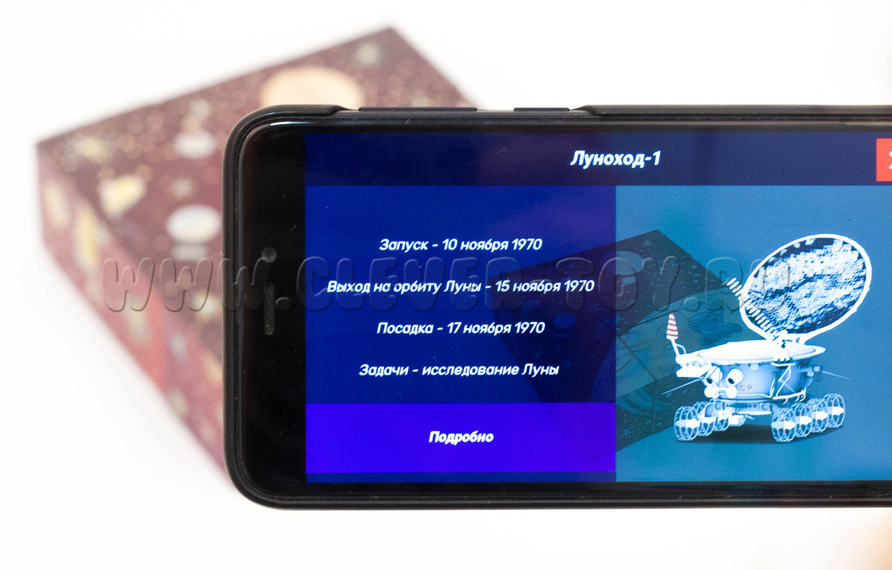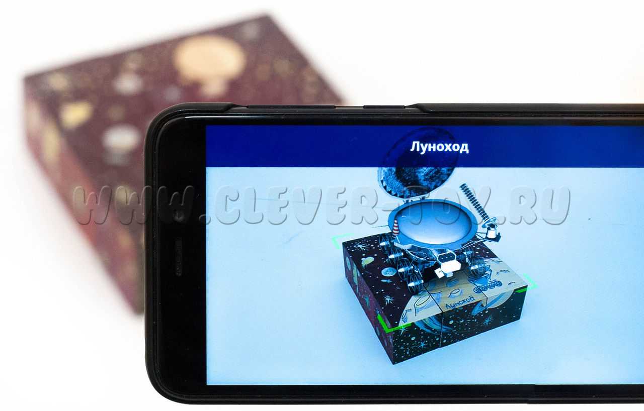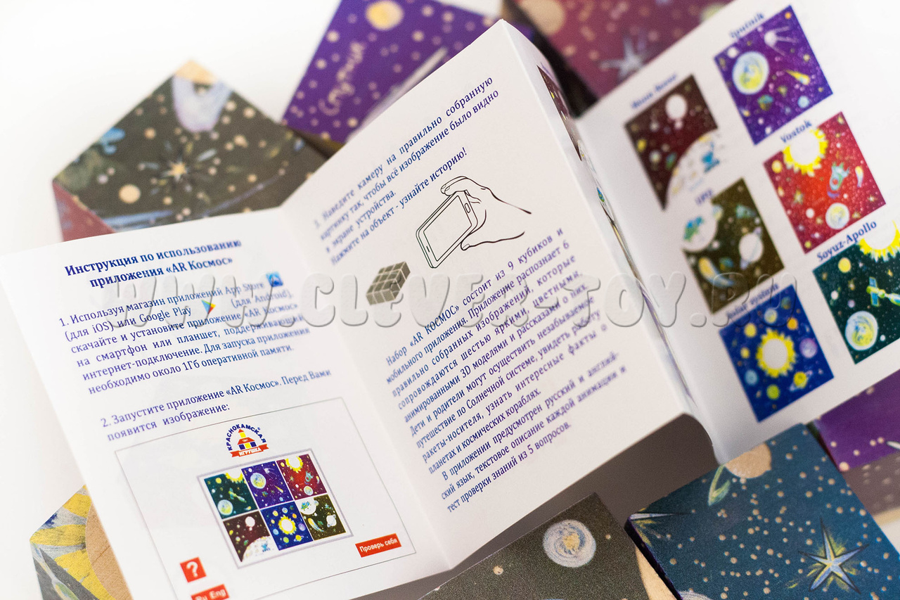 Из кубиков ваш ребёнок может собрать 6 изображений на космическую тему: "Солнечная система", "Луноход", "Спутник", "НЛО", "Восток", "Союз-Аполлон". Мобильное приложение для iOS и Android распознает каждое правильно собранное изображение, и перед глазами ребёнка чудесным образом появляется анимированная 3D модель Солнечной системы. Каждый элемент этого интерактивного представления активен: нажав на любую планету, ракету, спутник, родители и дети узнают интересные факты о жизни планет и устройстве космических кораблей.