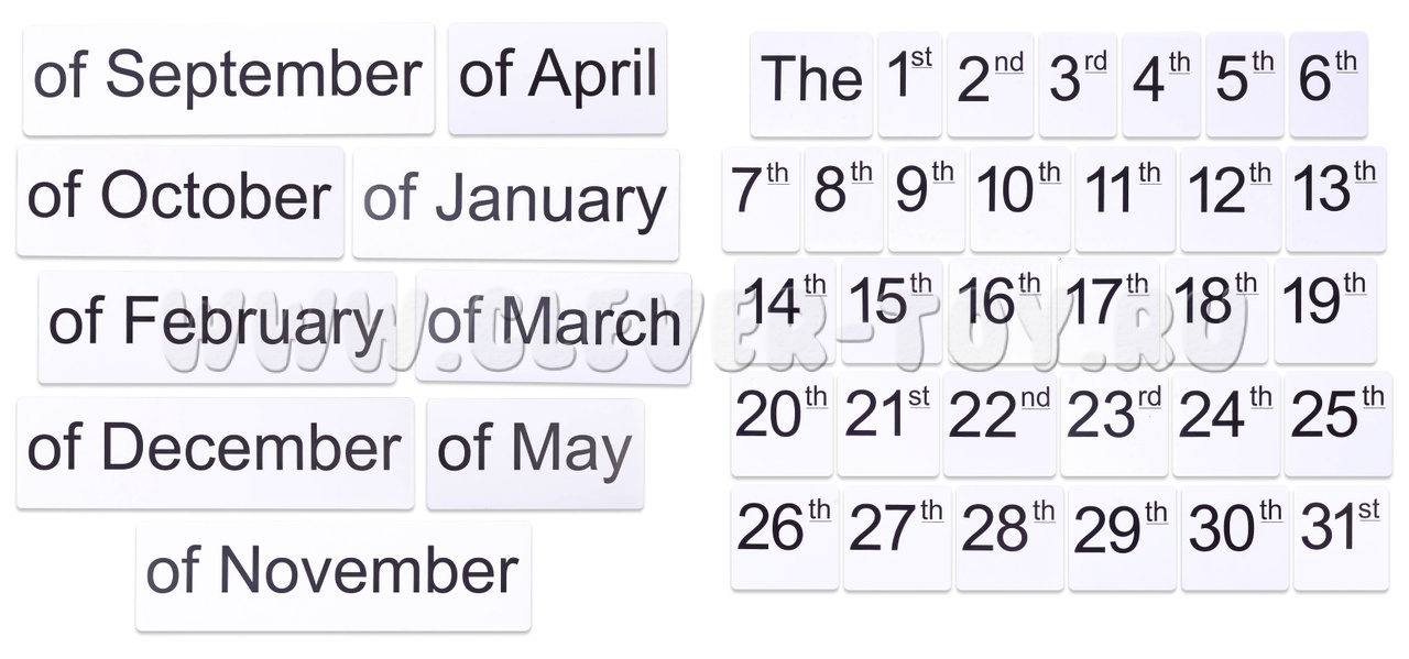 В комплект входят карточки с числительными от 1 до 31 и карточка с артиклем "The", а еще 9 карточек с названиями месяцев (исключая летние месяцы). Все карточки имеют оптимальный размер, что обеспечивает отличную видимость даже с дальних парт.