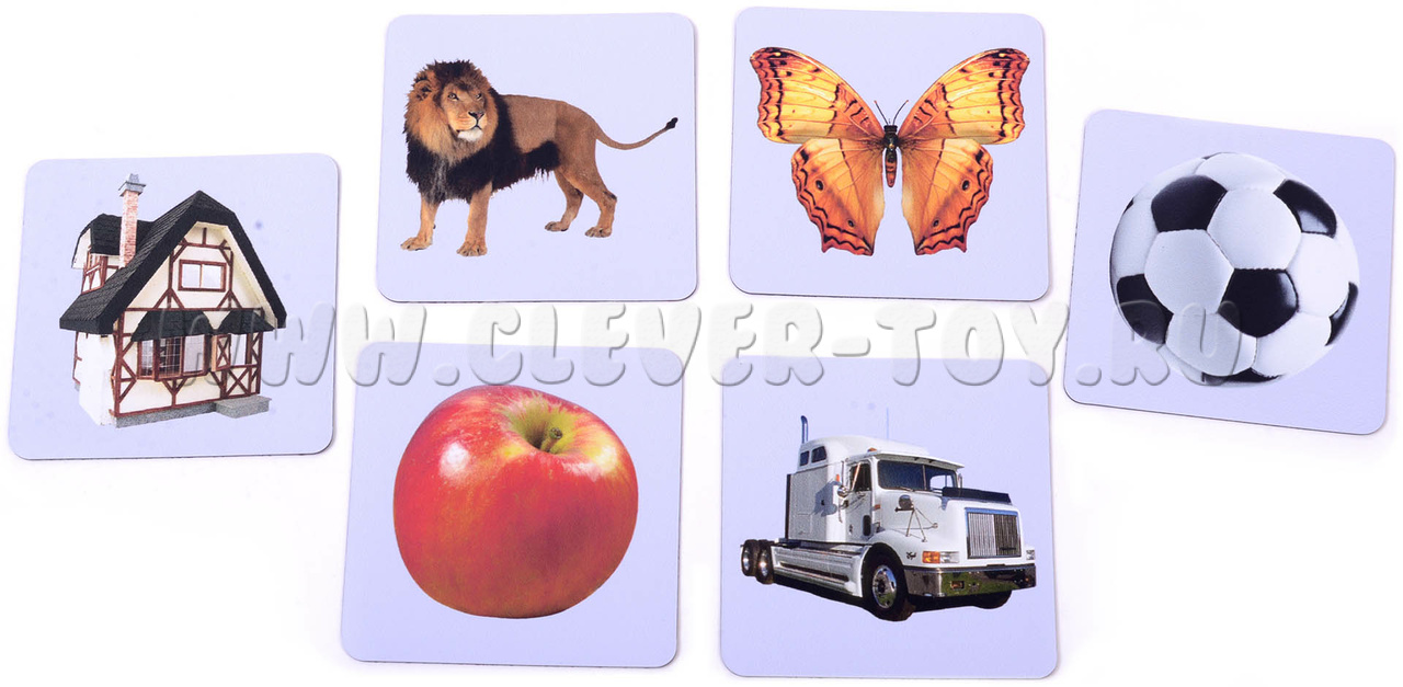 В наборе 30 карточек. Изображены 6 предметов: дом, яблоко, машина, лев, мяч, бабочка.