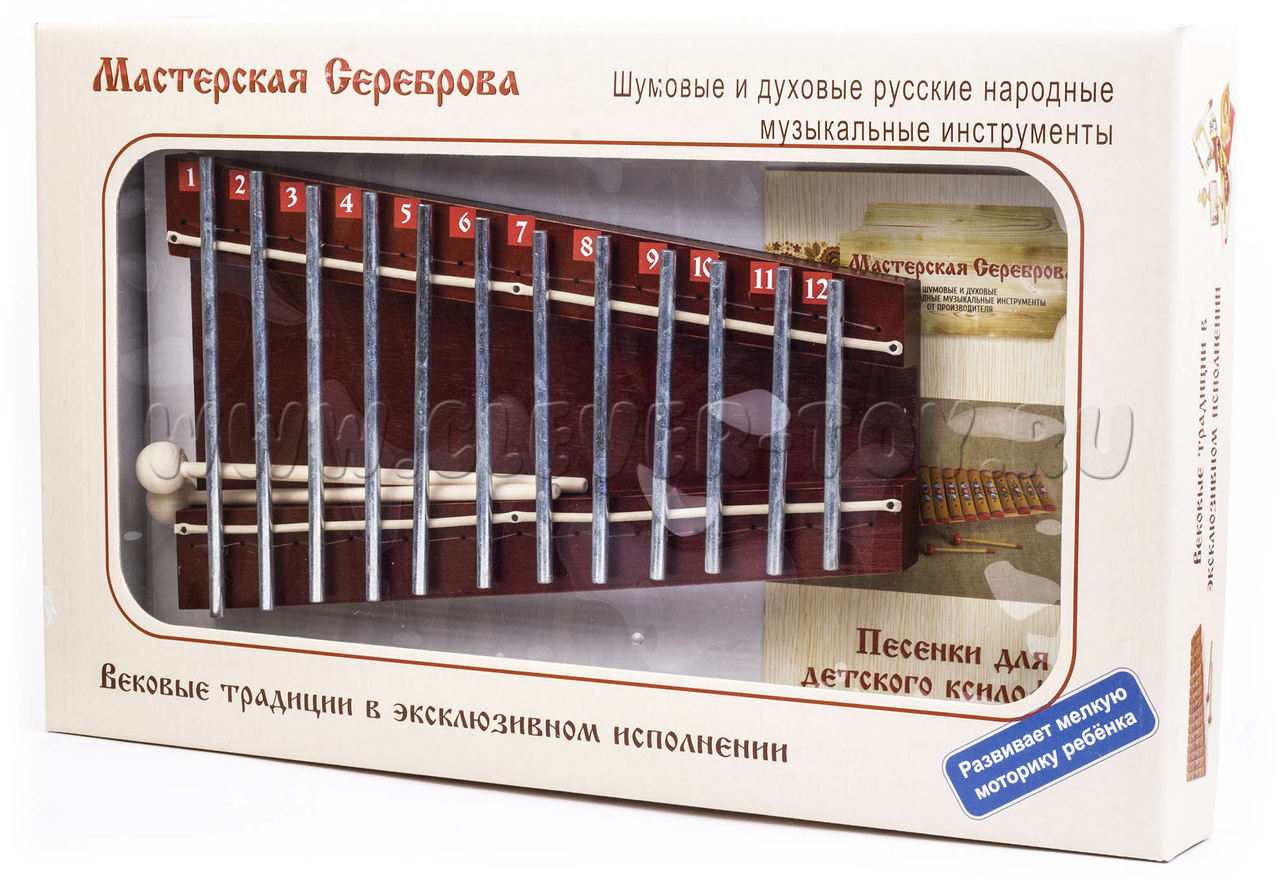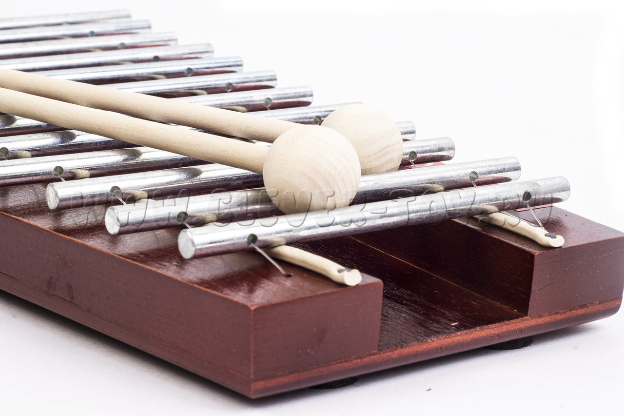 Металлофон изготовлен из 12 стальных прутков диаметром 6 мм, которые крепятся к резонатору. После закалки и гальванической обработки металл имеет мягкий, певучий и благозвучный голос.