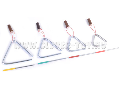 4 музыкальных треугольника (длина стороны - 8, 10, 12, 14 см) с качественной тембральной окраской, благородным и певучим звуком (до 20 секунд).