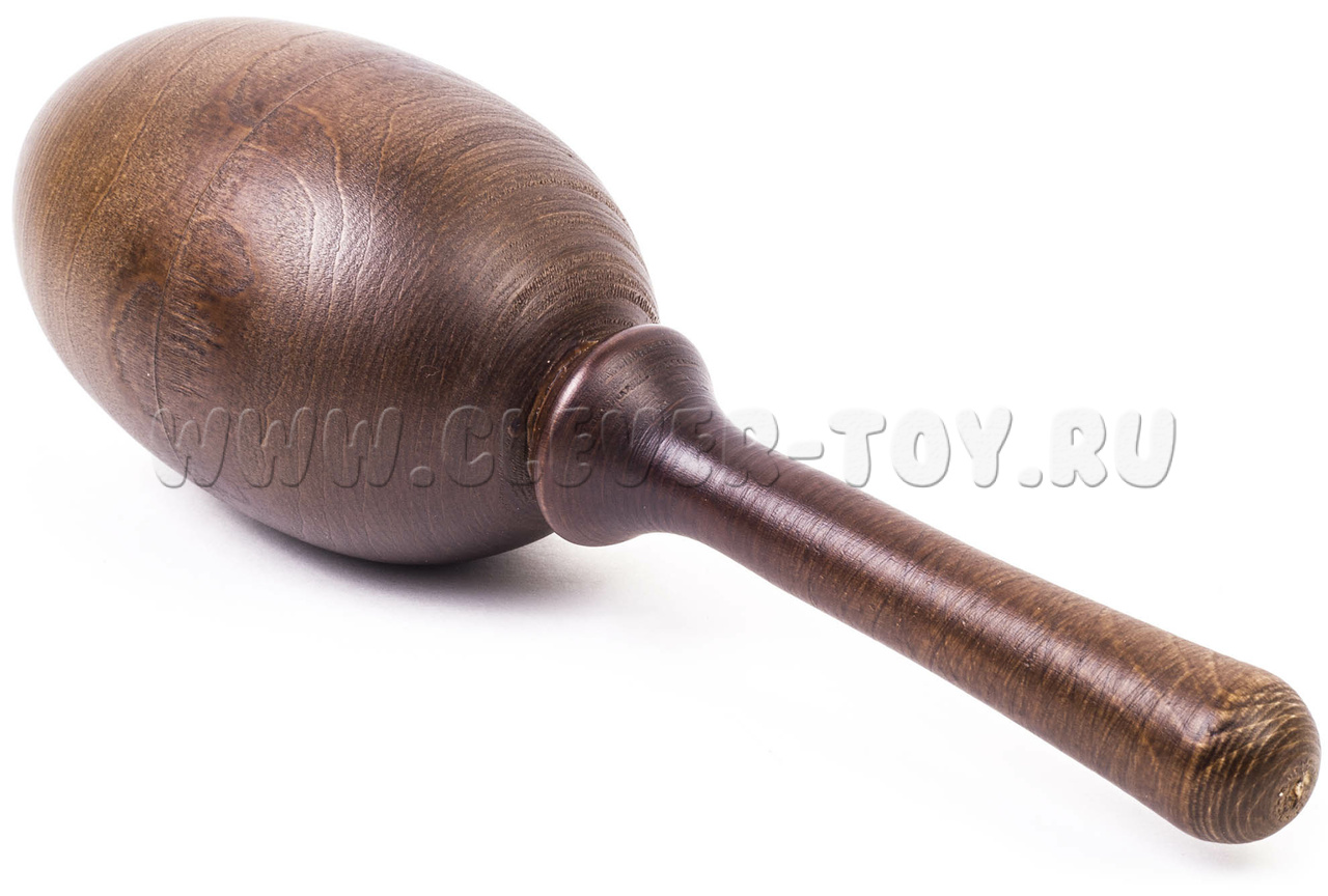 Погремушка представляет собой пустотелый деревянный предмет яйцеобразной формы. Внутрь погремушки засыпана охотничья дробь. В нижней части погремушки крепится фигурная ручка токарной работы. Материал: липа.