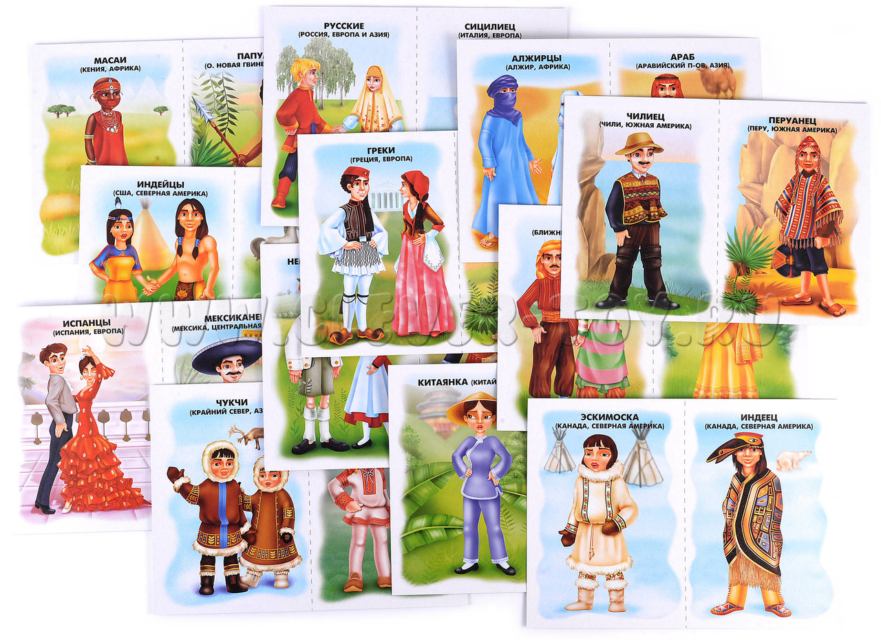 Список карточек (национальностей): Алжирцы, Американец, Араб, Греки, Индеец, Индейцы, Индианка, Испанцы, Маори, Масаи, Мексиканец, Немцы, Папуас, Перуанец, Русские, Саамы, Сицилиец, Турки, Чилиец, Чукчи, Шотландец, Эскимоска.