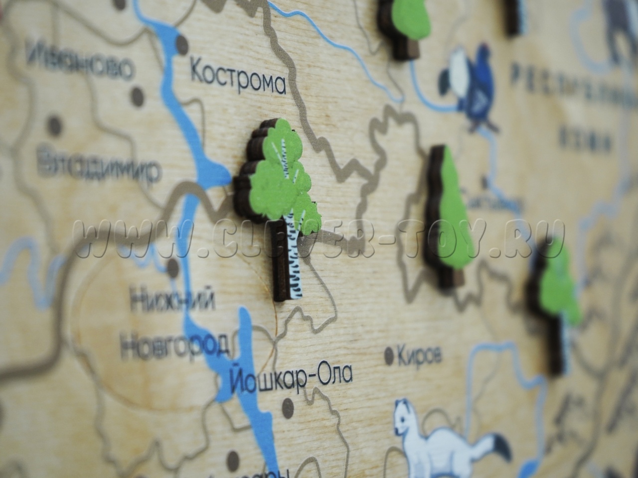 Настенная карта состоит из основы из прозрачного акрилового пластика, на который крепится карта из экологичной березовой фанеры. Сверху идет UF-печать стойкими к выцветанию красками, которая обеспечивает яркость и четкость изображений на протяжении длительного времени.