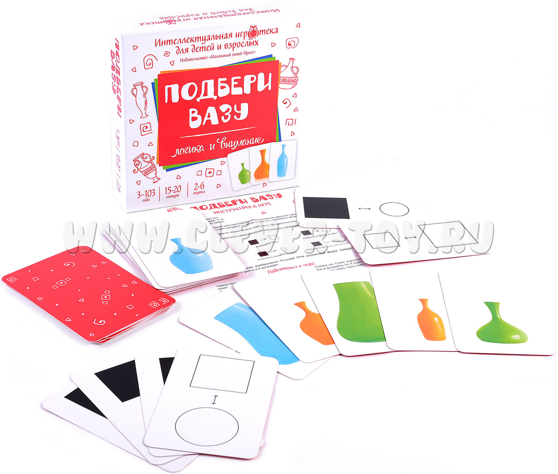 В набор входит 6 черно-белых карточек с символично обозначенными заданиями, инструкция и 30 цветных карточек с изображениями ваз, отличных друг от друга по форме, цвету и размеру.