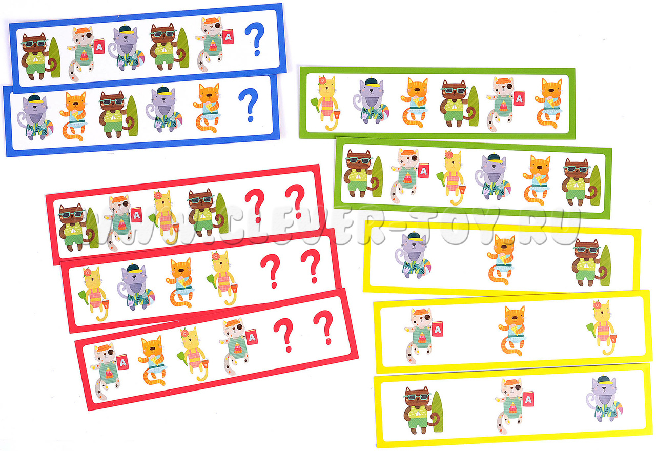 - Игра для поля с шезлонгами (обратная сторона игрового поля). Начинайте с заданий в зеленой рамке: воспроизводите заданную карточкой последовательность котят. Более сложные задания предлагают не только продолжить ряд, но и установить взаимосвязь и закончить последовательность самостоятельно. К этим заданиям стоит переходить, когда малыш уверенно справляется с зелеными карточками.