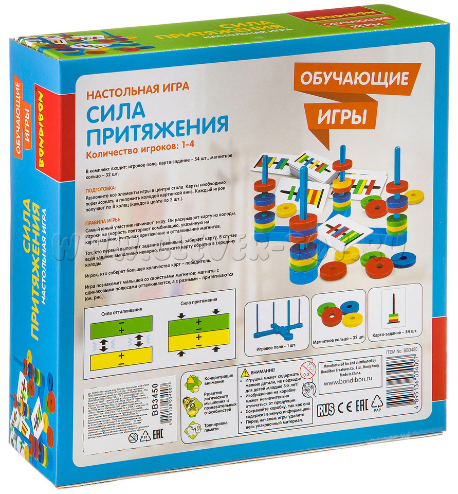 Откройте карту-задание из колоды. На скорость повторите комбинацию, указанную на ней, учитывая притяжение и отталкивание магнитов. Кто первым выполнит задание - забирает карту. 5 заработанных карт - победа!