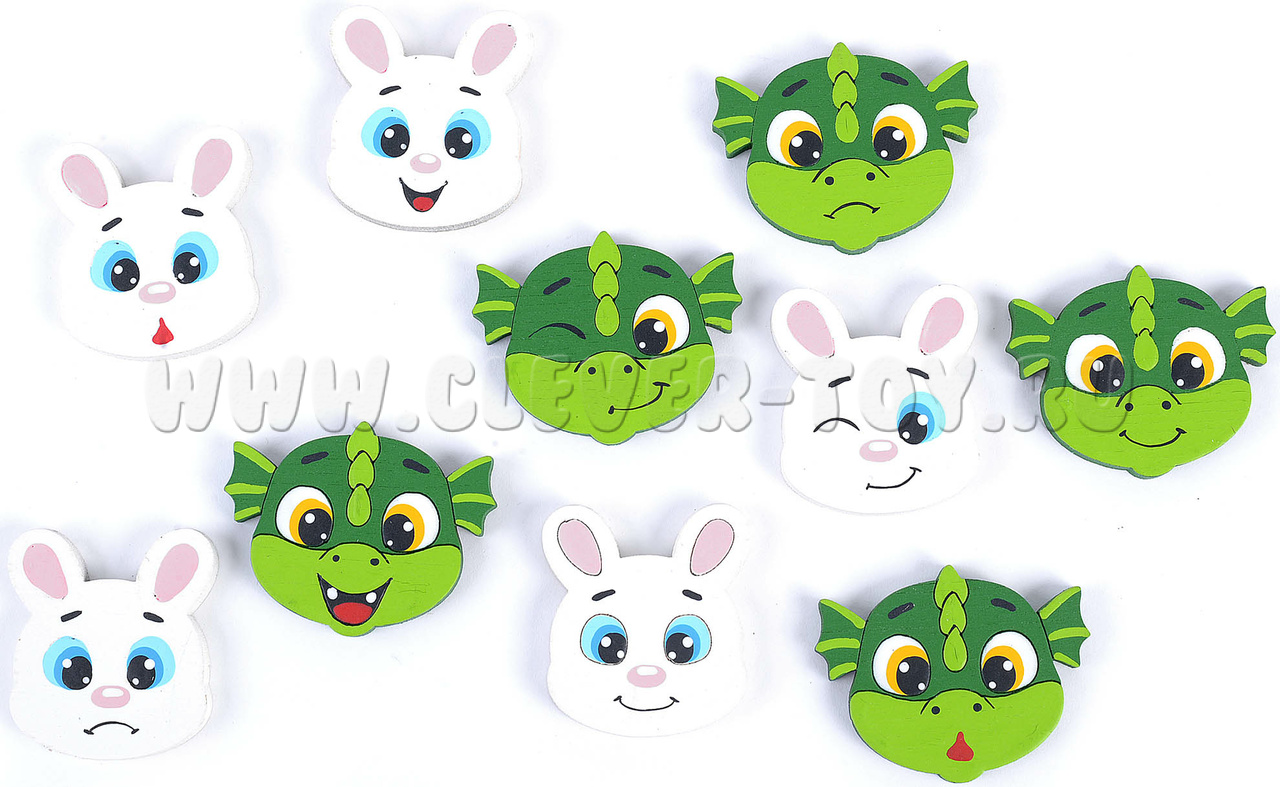 Правила игры: очередность ходов не имеет значения, так как оба набора фигурок (зайчики и дракончики) представлены в количестве 5 штук каждый.