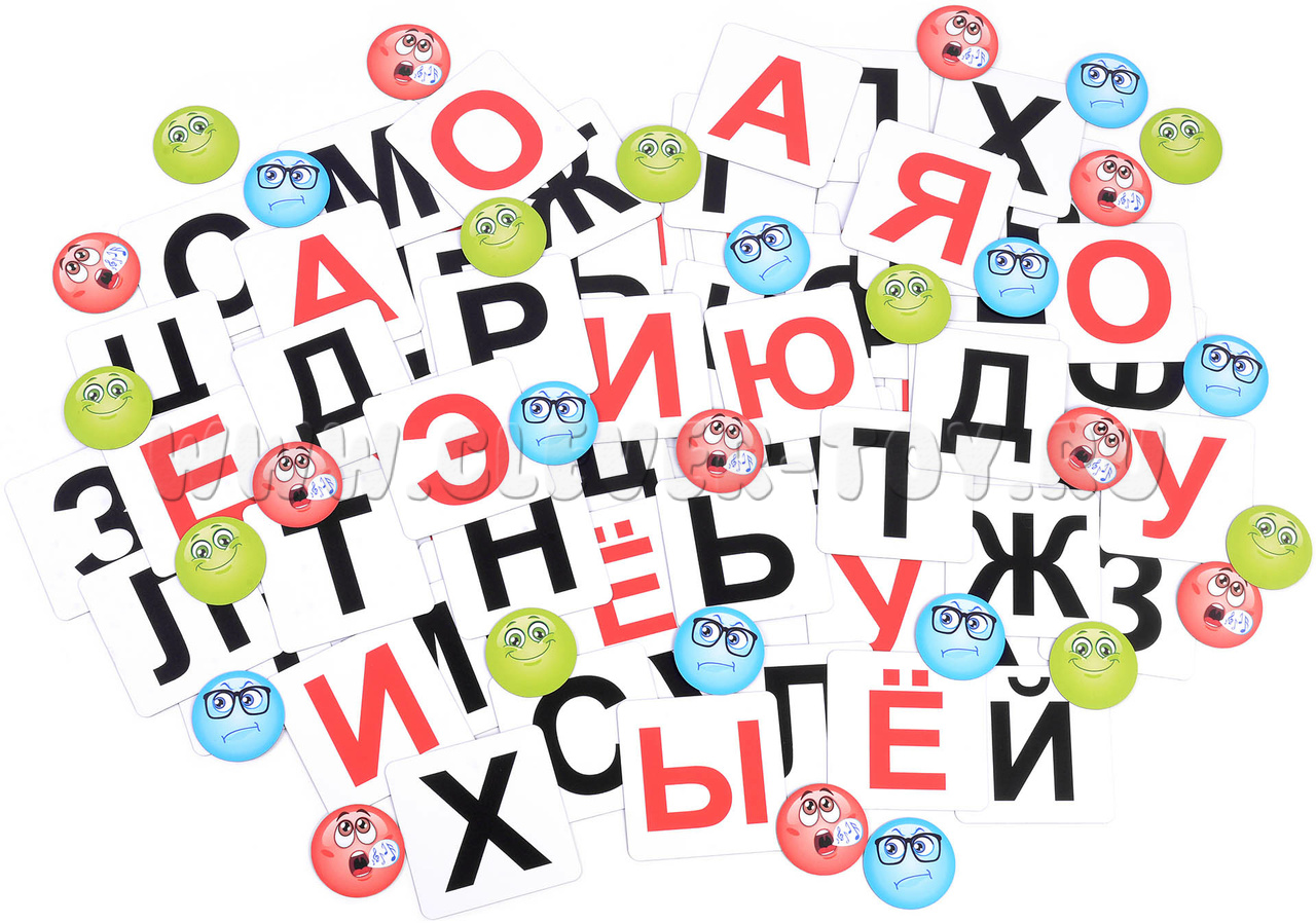 В комплекте 71 магнитные карточки с буквами, 1 пустая карточка, 30 магнитных смайлов.