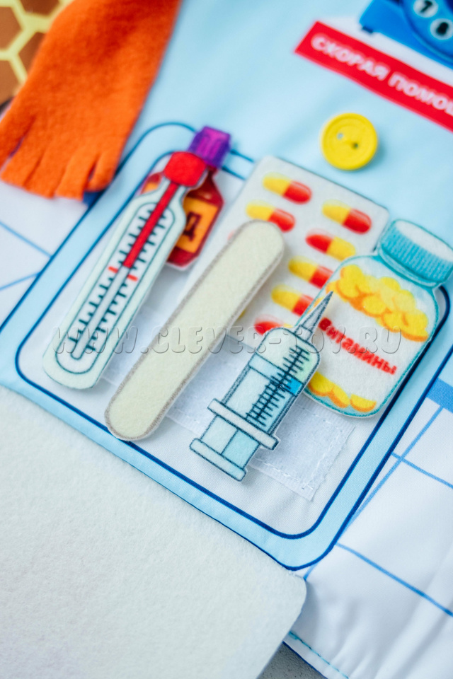 Вместе с куклой ребёнок будет лечить своих игрушечных друзей, прослушивать их, проверять зрение и слух, записывать результаты. В папке есть все необходимые медицинские инструменты и препараты.