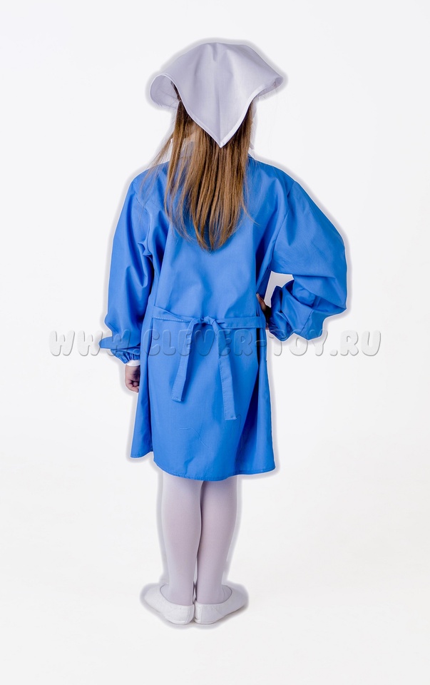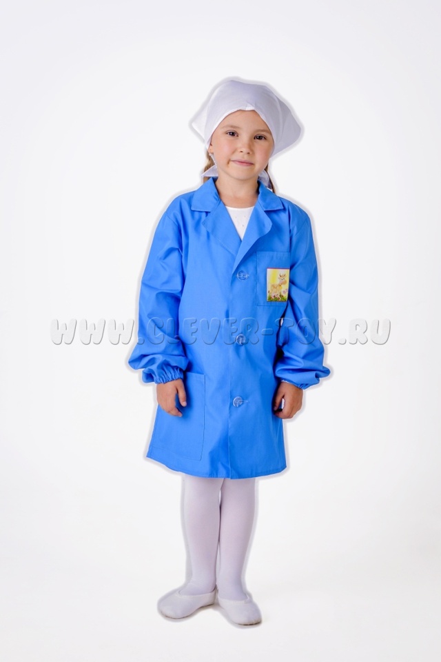 Комплектация (2 предмета): халат на двух пуговицах с завязками сзади и длинными рукавами по низу на резиночке, 2 кармана: на груди и внизу; косынка.