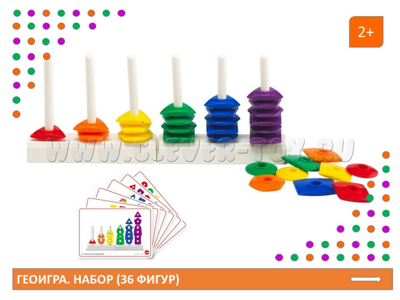 • 36 деталей (в 6 цветах) в форме 6 геометрических фигур: треугольник, круг, прямоугольник, квадрат, пятиугольник, шестиугольник; каждая деталь по центру имеет отверстие для нанизывания;