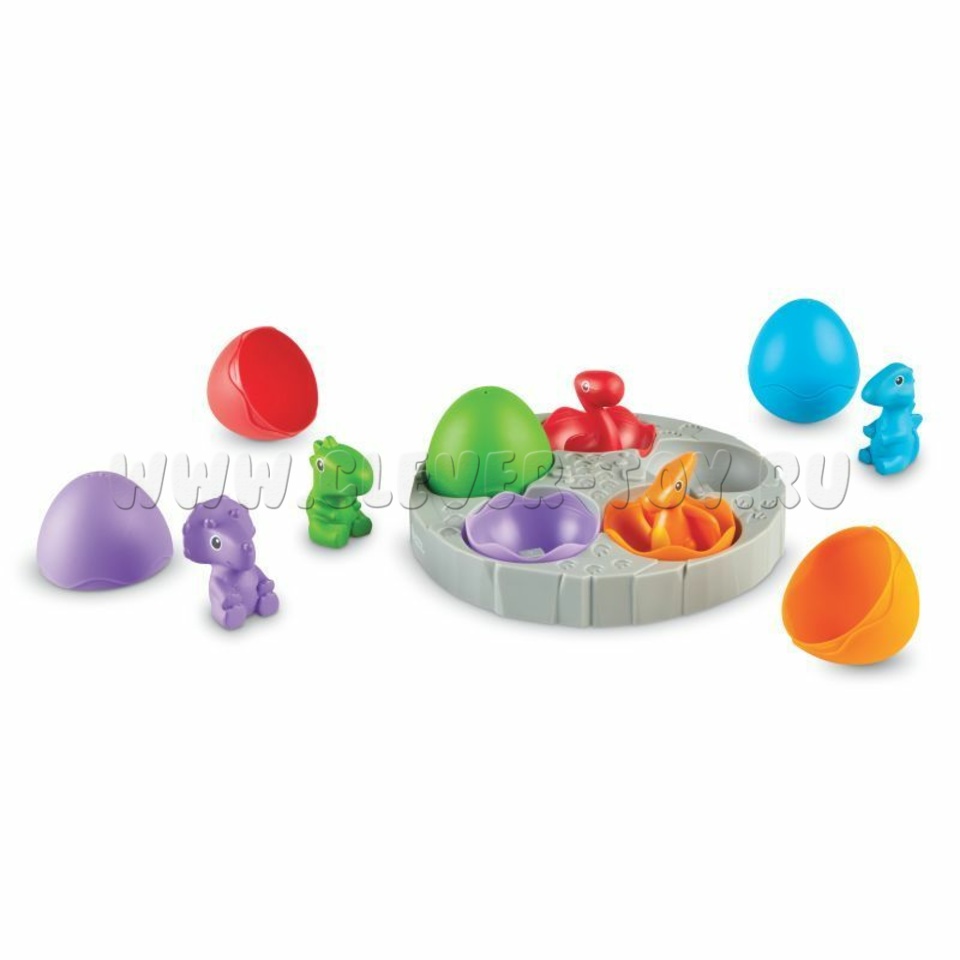 В этом гнезде 5 разноцветных яиц, внутри которых прячутся маленькие динозаврики. Малыш может познакомиться с ними, надевая их на пальчики, придумывая имена, подмечая различия между ними по форме и цветам, продумывая истории их взаимодействий и отношений. После игры для каждого детеныша нужно найти свой домик-яйцо, определив его по цвету. Сосчитать: все ли на месте?